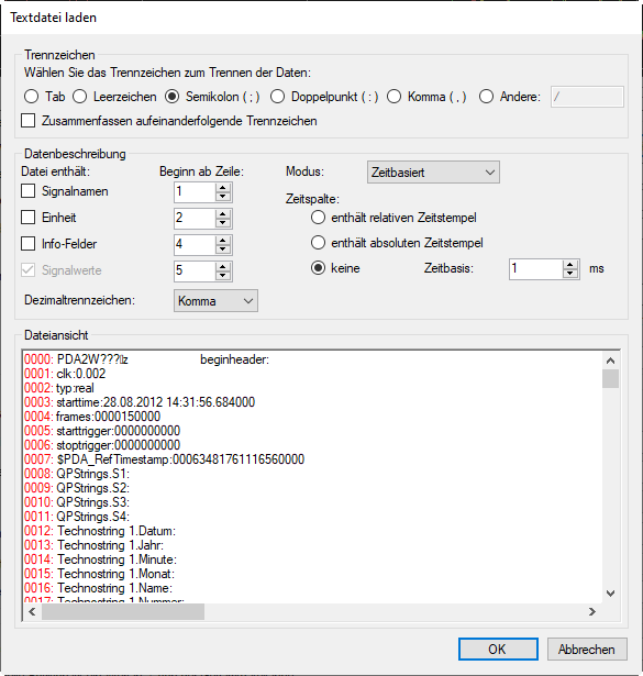 Im Bereich Datenbeschreibung definieren Sie, in welcher Zeile sich Signalnamen, Signaleinheiten und Informationsfelder befinden und in welcher Zeile die Daten beginnen.