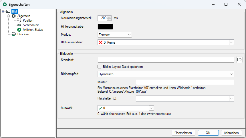 Ordner können nach neuen Bilddateien überwacht werden. Geben Sie hierzu den Ordner und das Bilddateiformat an. Bei Auswahl können Sie definieren, ob das neueste, zweitneueste usw. Bild angezeigt werden soll. "0" wählt das neueste Bild aus, "1" das zweitneueste, usw.