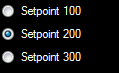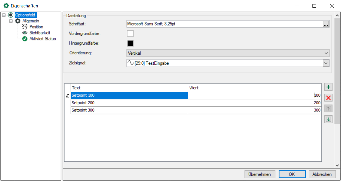 Das Optionsfeld dient zur Eingabe eines Signalwertes auf ein beschreibbares Signal (Zielsignal). Es können mehrere Optionen mit unterschiedlichen Signalwerten definiert werden. Durch Anklicken kann eines der Optionsfelder ausgewählt werden und der Wert wird auf das Zielsignal geschrieben.