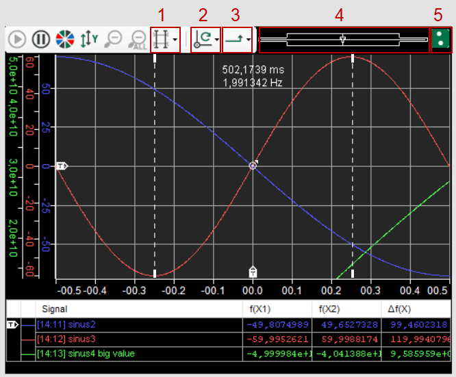 Functions and properties of the scope view in ibaQPanel correspond to those of a normal scope view in ibaPDA. Each view supports one base axis and multiple signals on multiple value axes.