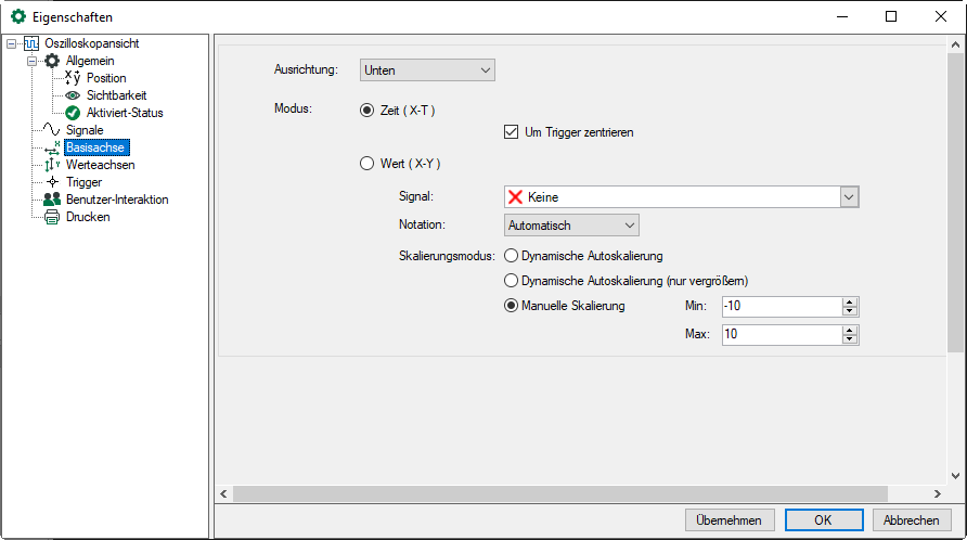 Für den Wert-Modus muss ein Signal im Dialog Eigenschaften konfiguriert sein. Die Basisachse verwendet dann die Signalwerte und wird dadurch eine Werteachse anstatt einer Zeitachse. Das Signal wird nicht in das Signalraster übernommen.
