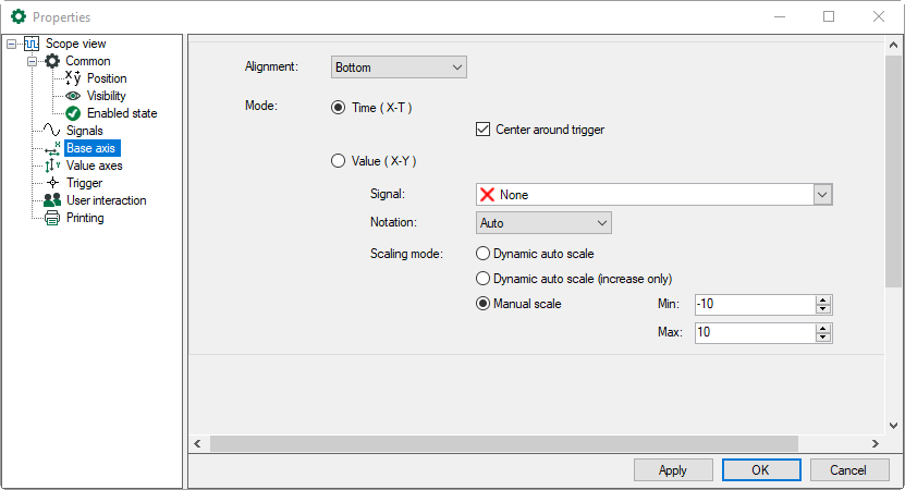 Value mode requires a signal to be configured in the properties dialog. The base axis then uses the signal values and thus becomes a value axis instead of a time axis. The signal will not be added to the signal grid.