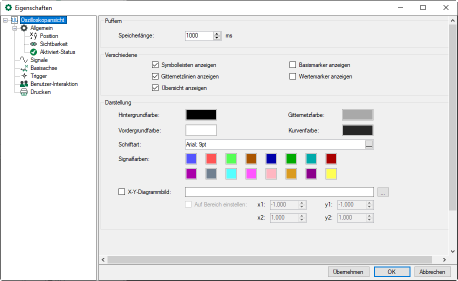 Im Eigenschaftsdialog wird das Aussehen der Oszilloskopansicht festgelegt.