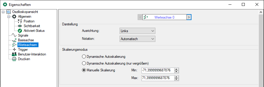 Im Eigenschaftsdialog Werteachsen werden Ausrichtung (links oder rechts) und Notation (automatisch, Standard oder wissenschaftlich) sowie der Skalierungsmodus (siehe Kapitel Werteachsen) festgelegt.