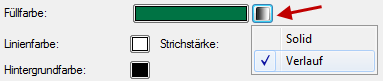 Rechtecke, Ellipsen und Polygone können mit einem Farbverlauf gefüllt werden. Öffnen Sie den Verlaufseditor mit einem Klick auf den Füllungsbutton und wählen Verlauf aus.