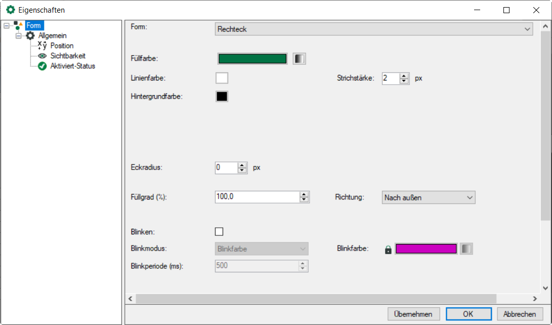 Für ein Rechteck können abgerundete Ecken definiert werden. Der Wert definiert den Eckradius in Pixel.