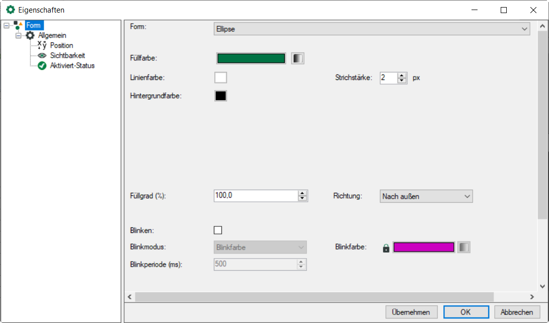 Der Füllgrad gibt an, zu welchem Anteil eine Form gefüllt ist. Füllgrad 100 bedeutet Füllung der gesamten Form. Mit der Richtung wird festgelegt, von welcher Seite die Form gefüllt wird. Zur Auswahl stehen: