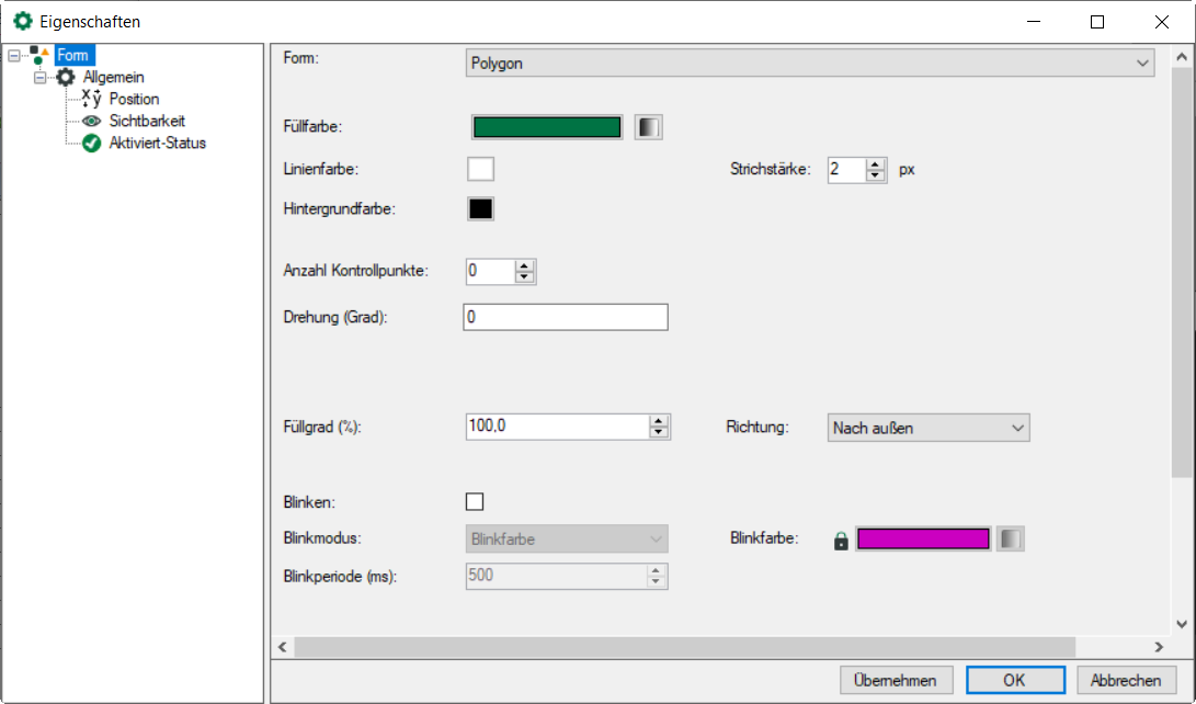 Blinkmodus transparent blinken: Wechsel zwischen sichtbar und unsichtbar Blinkfarbe: Wechsel zwischen oben definierter Füllfarbe und hier einstellbarer Blinkfarbe