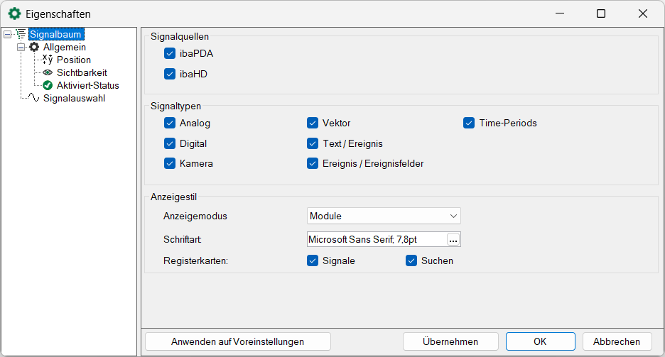 Sie können die Schriftart und -größe im Signalbaum festlegen.
