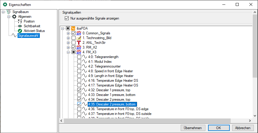 Mit der Signalauswahl können Sie festlegen, welche Signale im Signalbaum verfügbar sein sollen. Standardmäßig sind alle Signale verfügbar. Wenn Sie die verfügbaren Signale einschränken möchten, dann wählen Sie Nur ausgewählte Signale anzeigen und treffen Ihre Auswahl über die Kontrollkästchen im Signalbaum.