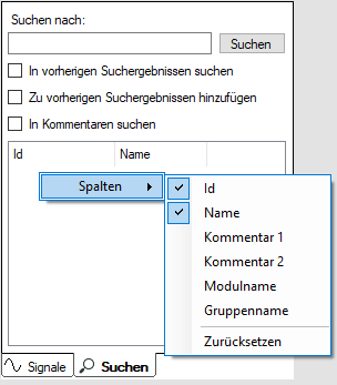 Die Suchfunktion ermöglicht es dem Benutzer, bestimmte Signale zu finden. Diese Funktion ist ähnlich der Suchfunktion im normalen ibaPDA-Signalbaum. Im Detail gibt es einige Unterschiede. Es ist möglich, auch in Gruppen zu suchen, wenn der Anzeigestil Gruppen ausgewählt ist. Ein weiterer Unterschied ist, dass der Modulname in einer Spalte sichtbar gemacht werden kann.