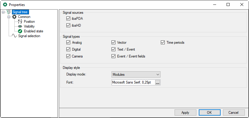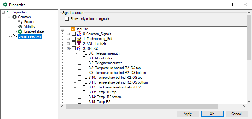 The signal selection allows you to determine which signals should be available in the signal tree. By default, all signals are available. If you want to limit the available signals then select “Show only selected signals” and make your selection by using the checkboxes in the signal tree.