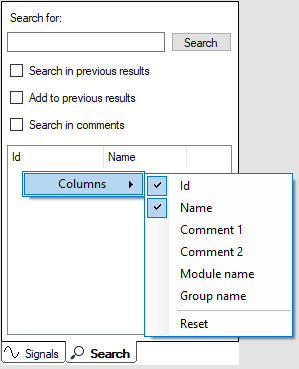 The search function allows the user to find certain signals. This function is similar to the normal ibaPDA signal tree. There are some differences in the details. It is possible to search also in groups if the group display style is selected. Another difference is that the module name can be made visible in a column.