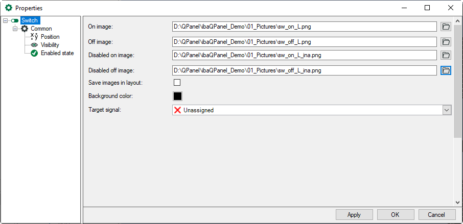 For every state, you can select an image file from the file browser. The images can have any bitmap image format, such as bmp, jpg, png, etc. The background color is valid for all states. Select the ibaQPanel input signal you want to write to at target signal.