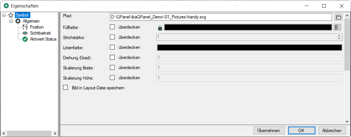 Wählen Sie über den Browser-Button den Symboldateipfad aus. Eine Eigenschaft des Symbols kann nur geändert werden, wenn das Auswahlfeld „überdecken" markiert ist.