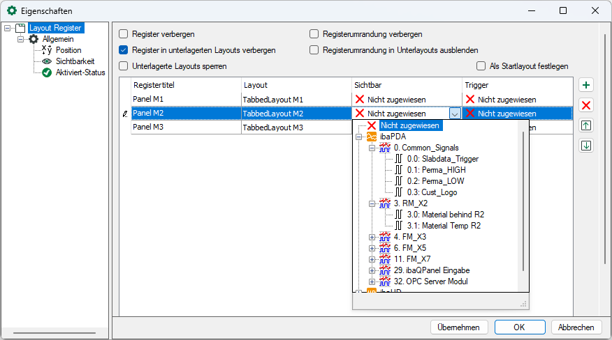 Sichtbar: Hier kann ein digitales Signal aus dem Signalbaum ausgewählt werden, das die Sichtbarkeit des Registers steuert. Bei fallender Flanke des Signals wird das Register verborgen, bei steigender Flanke ist es wieder sichtbar.