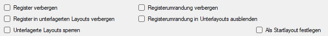 Mit den Checkboxen können Sie festlegen, ob die Register oder auch Register in unterlagerten Layouts verborgen oder angezeigt werden, ob die Registerumrandung im Layout oder in unterlagerten Layouts verborgen oder angezeigt wird, und ein Start-Layout festlegen.