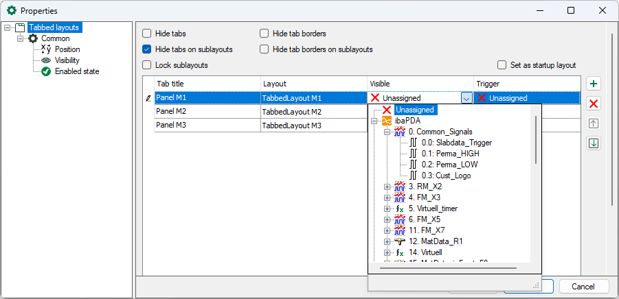 Visible: Here, a digital signal from the signal tree can be selected which controls the visibility of the tab. When the signal has a falling edge, the tab will be hidden; during rising edge it will be visible again.