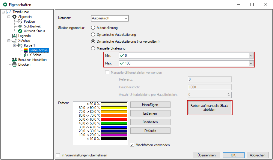 Sofern Sie die Skalierung der Farbachse manuell vornehmen, können Sie den oberen und unteren Grenzwert der Skala einstellen. Ein Klick auf die Schaltfläche <Farben auf manuelle Skala abbilden> zeigt Ihnen die Entsprechungen zwischen den Skalenwerten und den Farben im Farbschema an. Je nach Bedarf können Sie Farben hinzufügen, ändern oder löschen.
