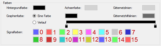 Die Farbe eines Signals kann dynamisch sein. Sie kann von einem anderen Signal gesteuert werden. In der Signaltabelle der Kurveneigenschaften können Sie das Signal für dynamische Farben festlegen (siehe Abb. oben). Dieses Signal muss ein Analogsignal von 0-15 sein. Zur Auswahl stehen 16 verschiedene Farben und je nach Wert wählt das Farbsignal eine von ihnen aus. Die 16 Farben können Sie in den Eigenschaften der Trendkurve bestimmen (siehe Abb. unten).