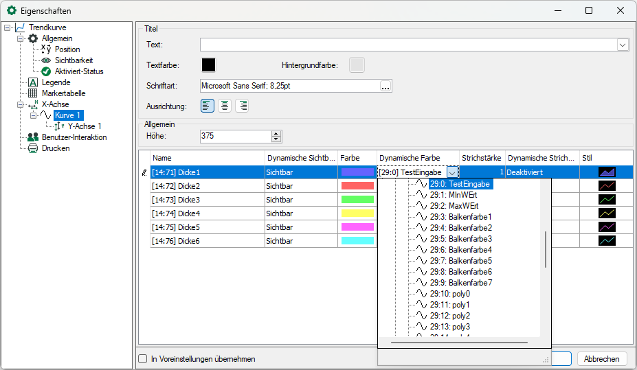 Die Sichtbarkeit und Strichstärke eines Signals können fest eingestellt werden oder dynamisch von einem anderen Signal gesteuert werden. So kann beispielsweise bei einem bestimmten Status die Kurve sichtbar oder nicht sichtbar sein oder die Strichstärke breiter dargestellt werden.