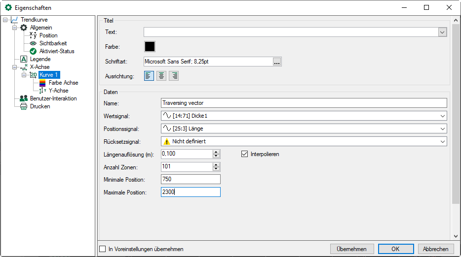 Wenn Sie diesen Befehl auswählen, erscheint der Dialog, in dem Sie die Eigenschaften des traversierenden Vektors festlegen können.