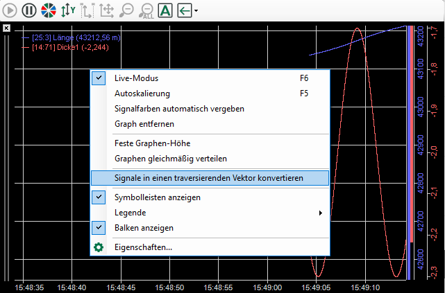 Befinden sich in einer Trendkurve (oder eine andere der o.g. Anzeigen) 2 Signale, erscheint im Kontextmenü der Befehl Signale in einen traversierenden Vektor konvertieren.