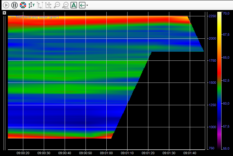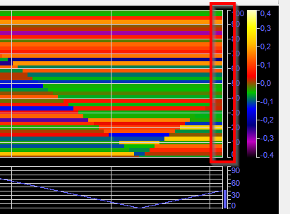Wenn Sie die Option Interpolieren aktivieren, werden die Daten sowohl in X- als auch in Y-Richtung interpoliert. Für die Interpolation werden 2 Werte benötigt, so dass ein Bereich nur gezeichnet werden kann, wenn ein neuer Punkt ankommt. Deshalb wird im interpolierten Modus eine schräge Kante entsprechend des Laufwegs des traversierenden Messkopfs dargestellt.