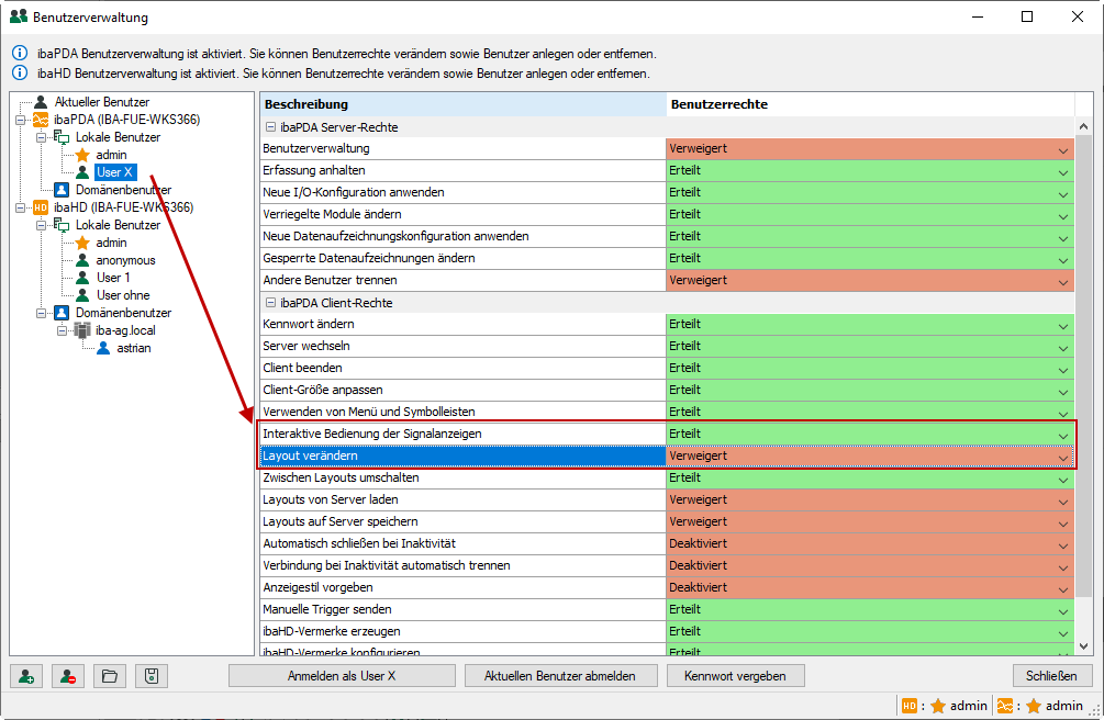 Im Knoten Benutzer-Interaktion können Sie festlegen, was der Benutzer tun darf, wenn er das Recht "Layout ändern" nicht hat, aber das Recht "Interaktive Bedienung der Signalanzeigen" hat.