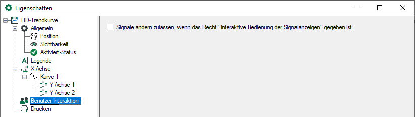 Mit dem Recht „Interaktive Bedienung der Signalanzeigen“ darf der Benutzer zoomen und die X-Achse verschieben. Wenn die Option „Signale ändern zulassen, …“ aktiviert ist, hat der Benutzer zusätzlich das Recht die Signale in der Trendkurve zu ändern. Der Benutzer darf Signale per Drag & Drop aus dem Signalbaum in die Trendkurve ziehen sowie Signale entfernen und neu anordnen.