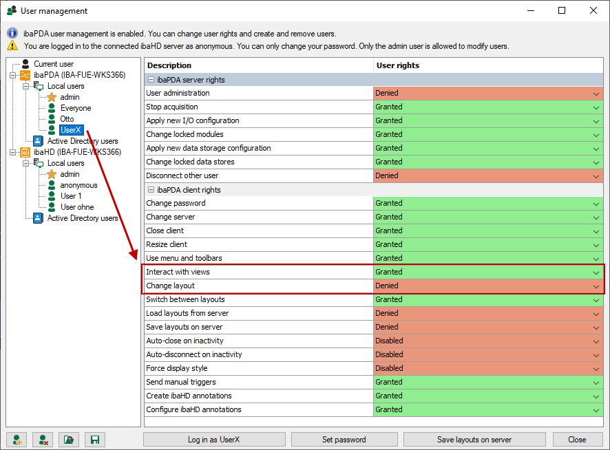 In the User interaction node, you can determine what the user is allowed to do when he doesn’t have the “Change layout” right but he does have the “Interact with views” right.