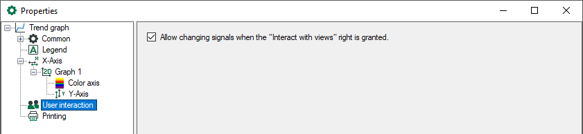 With the right "Interact with views" the user may zoom and move the X-axis. If the "Allow changing signals ..." option is enabled, the user additionally has the right to change the signals in the trend graph. The user can then drag & drop signals from the signal tree to the trend graph. He can also remove signals and rearrange the signals.