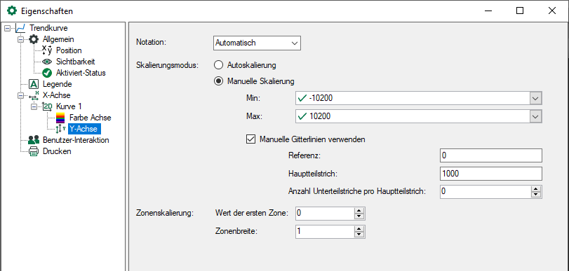 Die Zonenskalierung kann durch Zählen (Zonen 1 bis n) und "Zonenbreite" =1 eingestellt werden.