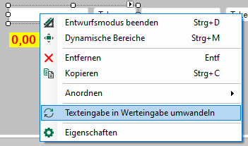 Die Werteingabe ersetzt das Texteingabeelement. Wenn Sie bisher Texteingabeelemente verwendet haben, können Sie diese in Werteingabeelemente konvertieren. Öffnen Sie im Entwurfsmodus das Kontextmenü des Texteingabeelements und wählen Sie Texteingabe in Werteingabe umwandeln.