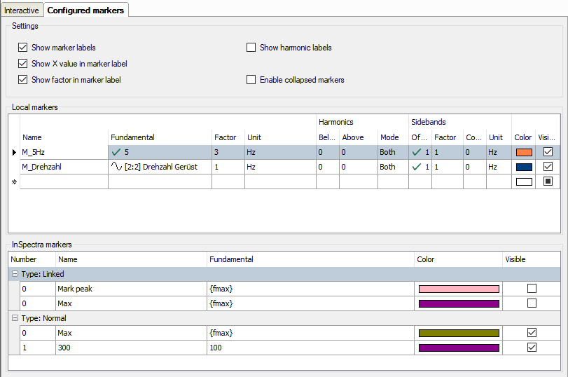The markers must first be defined and configured. You can configure the markers in the Properties dialog of the FFT view, in the “Marker” branch.