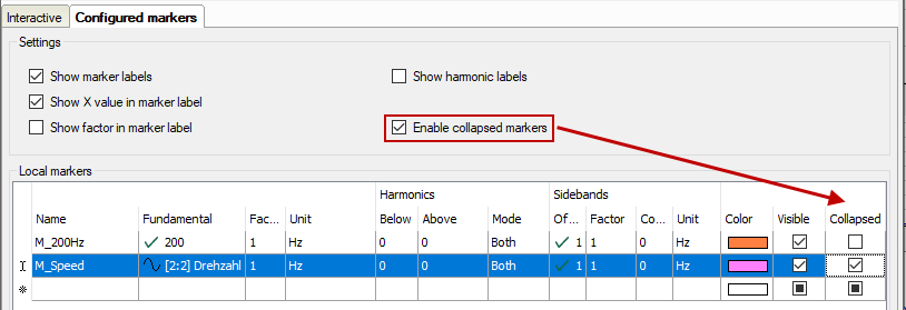 When you enable this option, an additional column appears in the marker table, in which you can decide for each marker whether it is normal, i.e. it should be displayed as a line and possibly with a label, or only as a triangle based on a spectrum.