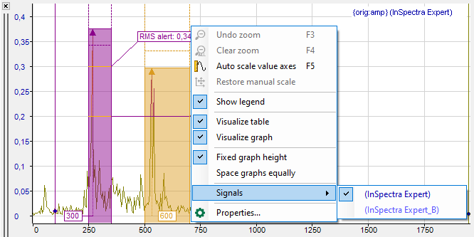 In the figure above the display shows three different frequency bands and at least a part of the spectral graphs from the main window. You can add additional graphs by dragging and dropping them from the main window or from the signal tree via drag & drop. The displays are linked so that all graphs in the small spectral display can also be seen in the main window.