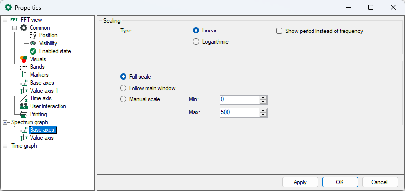 The display has a base axis corresponding to that of the main window. You can still modify the settings of the base axis in the display properties, for example, to select a logarithmic division instead of a linear division or to provide manual scaling. In addition, you can display the period instead of the frequency.