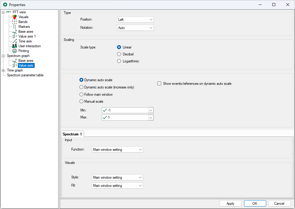 The spectrum graph has only one value axis. All charts in the display are displayed on the same scale of values. You can change the settings of the value axis in the properties of the display.