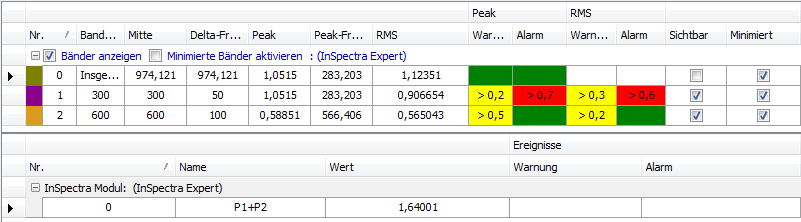 Für jedes Band werden die Kenngrößen und – sofern konfiguriert – die Ereignisse angezeigt. Im Bereich darunter werden Ergebnisse und Alarme für Kennwerte angezeigt. Für jeden Kennwert wird eine Zeile angelegt.