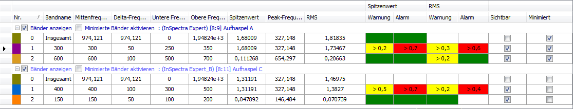 In der Tabelle wird automatisch für jedes definierte Band des dargestellten InSpectra-Moduls eine Zeile angelegt.