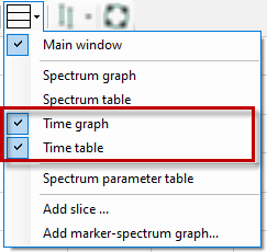 In addition to the main window, you can open a graphical and/or tabular display of the data of the input signal in the time domain. Click on the button for the window menu in the tool bar of the FFT view.