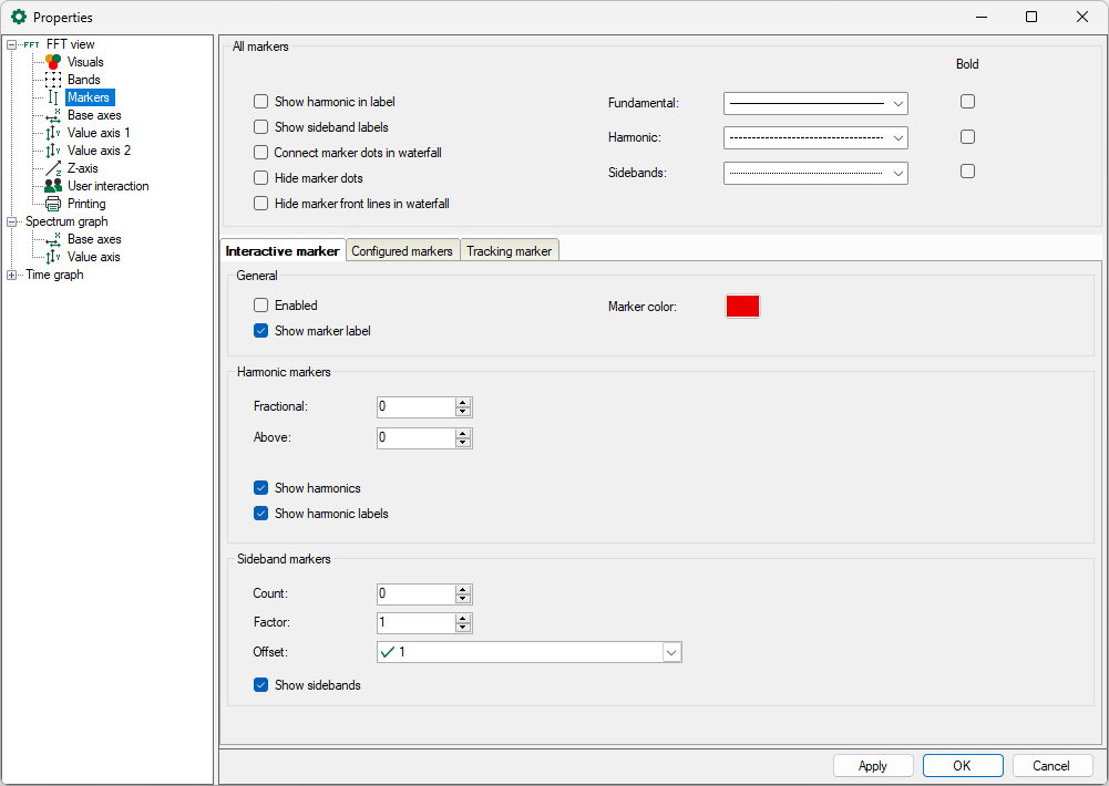You can make the general settings of the markers in the preferences. You will find individual settings for the FFT views in the properties of a view. For further information, see chapter Properties and preferences FFT view |