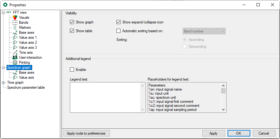 You can define here whether the graph and the data table for the spectrum graph are shown by default. Even if a view is disabled here, it can be re-enabled later in the FFT view toolbar.