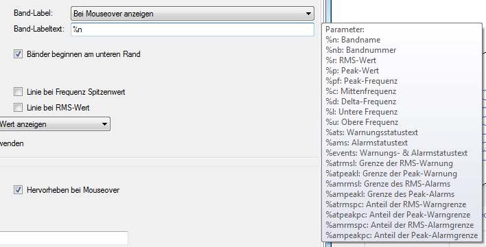 Sie können festlegen, wann die Band-Label angezeigt werden (nie, immer oder bei Mouseover) und was im Label angezeigt wird. Wenn Sie in das Feld Band-Labeltext klicken, erscheint eine Auflistung von Parametern, die Sie für dynamische Informationen im Labeltext verwenden können.