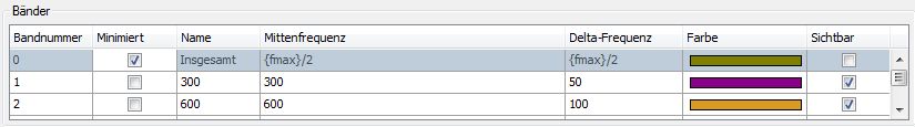 Die in einem InSpectra-Profil konfigurierten Bänder werden in der Tabelle unten im Dialog angezeigt. Name, Mittenfrequenz und Deltafrequenz sind bereits im InSpectra-Profil definiert und können hier nicht mehr verändert werden. Die Farbe und Sichtbarkeit können hier noch verändert werden.