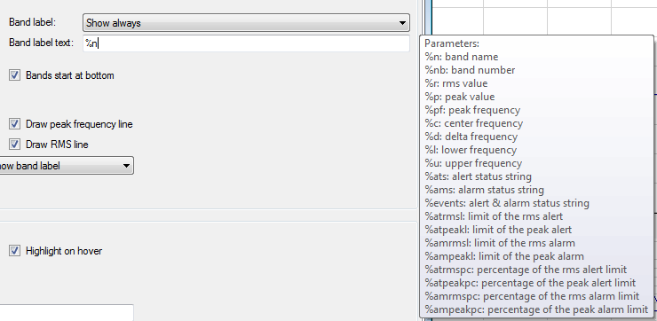 You can determine when the band labels are displayed (never, always or on hover) and what is displayed in the label. If you click the band label text field, a list of parameters appears that you can use for dynamic information in the label text.