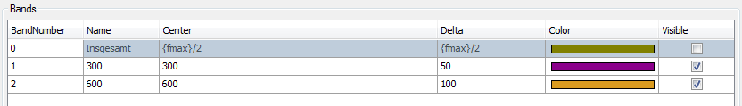 The bands configured in an InSpectra profile are shown in the table below in the dialog. The name, center frequency and delta frequency are already defined in the InSpectra profile and can no longer be changed here. The color and visibility can still be changed here.