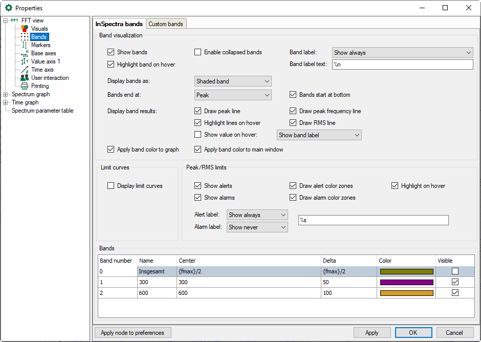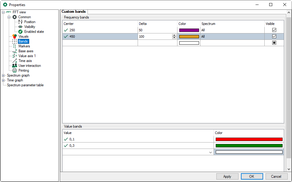 In the custom bands tab, you define the frequency bands with a static or dynamic center frequency and a delta frequency. You can allocate a color to the band and a certain spectrum or all spectra.