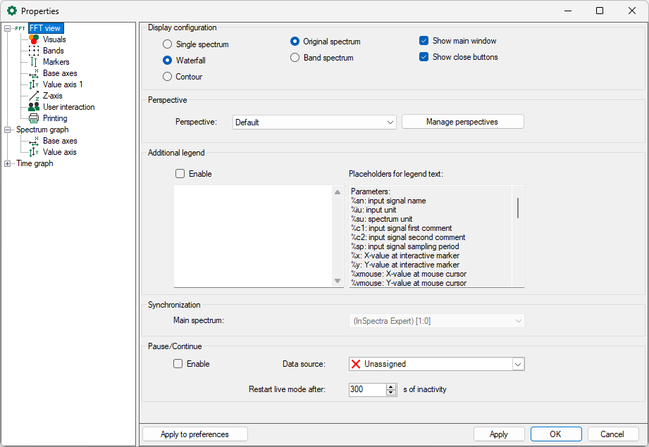 In the FFT view of ibaInSpectra (ibaPDA), ibaAnalyzer-InSpectra and ibaQPanel, all settings can be adopted node by node in the preferences and are thus applied to the newly opened FFT views. Changes can be saved by pressing the button <Apply node to preferences>. The preferences cannot be viewed separately in ibaAnalyzer. A new FFT view must be opened in order to view preferences. In ibaPDA, you open the preferences via the menu Configuration - Preferences.